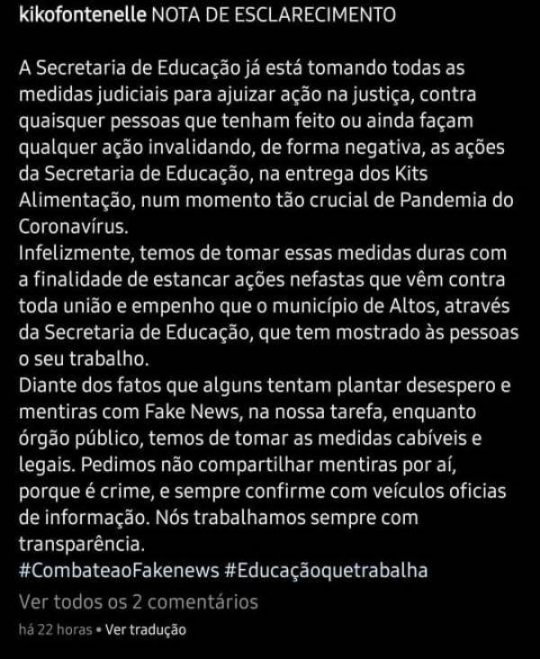 O Vereador Kiko Fontenele, que pertence a base aliada da prefeita Patrícia Leal, postou uma nota de esclarecimento em sua conta do instagram onde ameaça as pessoas que ousarem tocar no assunto de merenda vencida na cidade. Veja a postagem: