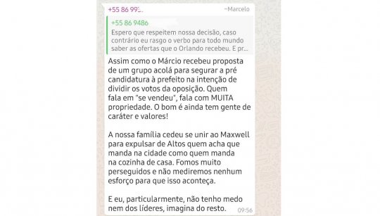 “Assim como o Márcio recebeu proposta de um grupo acolá para segurar a pré-candidatura à prefeito na intenção de dividir os votos da oposição. Quem fala em "se vendeu", fala com MUITA propriedade. O bom é ainda tem gente de caráter e valores!”, disse Marcelo.