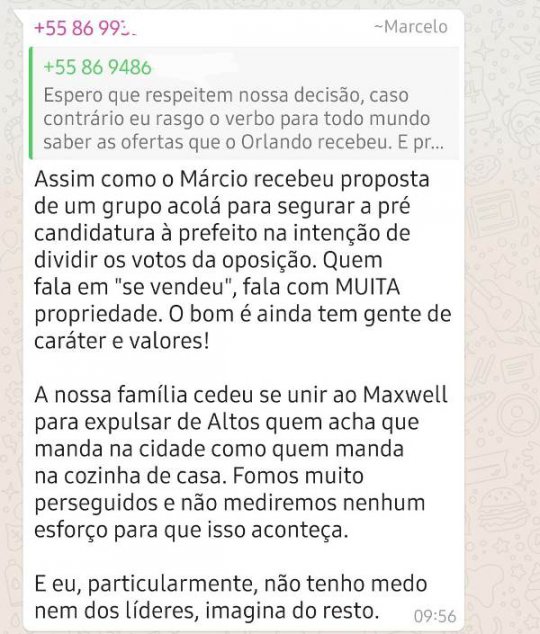 O jornalista Marcelo Fontenele revelou em um grupo de whatsapp que seu irmão, Márcio Fontenele, foi um dos que recebeu a proposta. Márcio era pré-candidato a prefeito e decidiu apoiar Maxwell da Mariinha e ser pré-candidato a vereador.