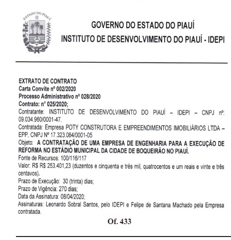 O Instituto de Desenvolvimento do Piauí – IDEPI divulgou o resultado de julgamento de propostas de preço da carta convite Nº 002/2020, processo administrativo 28/2020, com o objetivo de contratar empresa de engenharia para a reforma do estádio municipal na cidade de Boqueirão do Piauí.