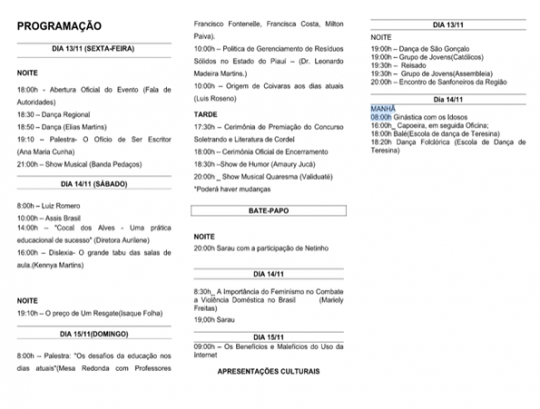 No domingo (14) é a vez de bate-papo literário com o professor Luis Romero e na sequência com o homenageado Assis Brasil. Depois tem a palestra “Cocal do Alves – Uma prática Educacional de sucesso” com a diretora Aurilene.