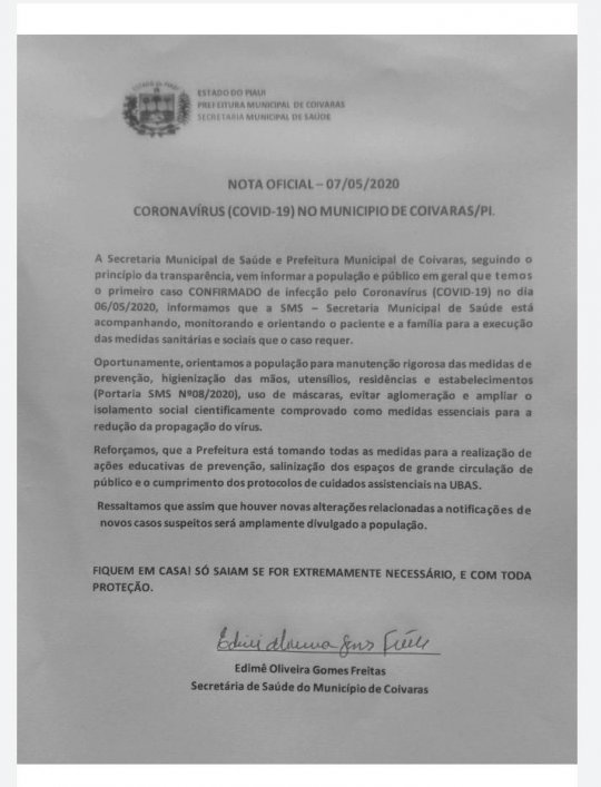 A Prefeitura do Município de Coivaras emitiu nesta quinta-feira (07) informando sobre o primeiro caso confirmado de Covid-19 no município. O paciente não teve informações reveladas.