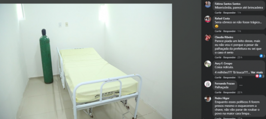 “A ala está equipada com leitos clínicos”, disse a prefeita Patrícia Leal em uma postagem em seu facebook que acabou virando polêmica. Os seguidores da gestora questionaram a aplicação correta dos recursos por conta das imagens que mostram poucos, ou quase nada nas salas, principalmente na sala onde seriam o leito clínico onde aparece apenas uma cama de ferro com um colchão e um cilindro ao lado sem nenhum acessório para que possa ser utilizado.