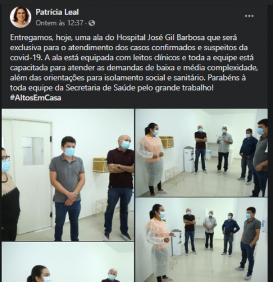 A Prefeita Patrícia Leal informou em um vídeo que estava “entregando à população essa área feita exclusivamente para as pessoas com suspeita de COVID. Preparamos leitos novos, colchoes novos, lençóis novos, dispensadores de álcool em gel, lixeira, tudo de acordo com o protocolo. A gente obedeceu ao protocolo que existe para o COVID”.