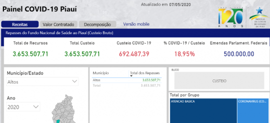 A Prefeitura de Altos foi beneficiada com um montante de R$ 3.653.507,71. Destes, apenas R$ 6 mil aparecem como gastos realizados até o momento, conforme dados do Tribunal de Contas do Estado (TCE-PI). O TCE criou uma ferramenta “Painel Covid-19 Piauí”, que permite o acompanhamento, de forma rápida e simplificada, dos recursos que vêm sendo recebidos e utilizados pelo Estado e pelos municípios piauienses no combate à pandemia do novo coronavírus.
