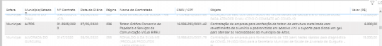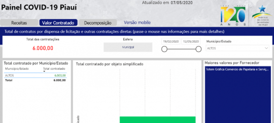 O gasto feito pela Prefeitura de Altos, segundo relatório do TCE, foi com uma gráfica que foi contratada para confecção de totem de estrutura metálica com revestimento de alumínio personalizado em adesivo vinil e suporte para álcool em gel.