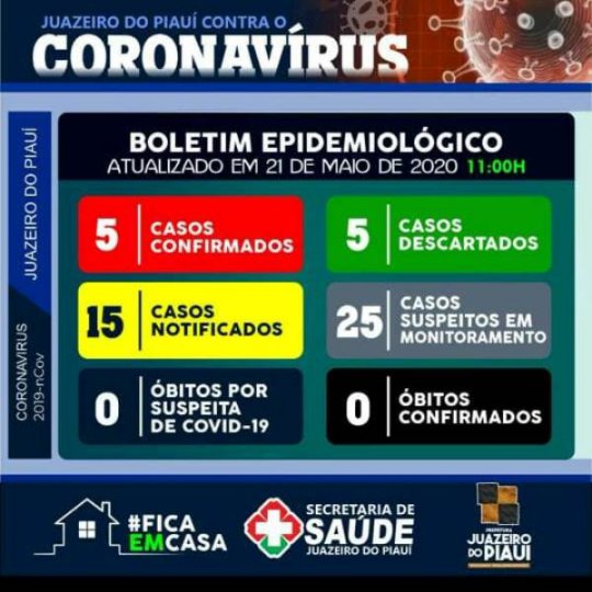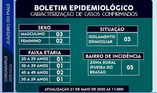 A secretaria municipal de Saúde de Juazeiro do Piauí divulgou que mais quatro pessoas testaram positivo para o novo coronavírus no município, chegando a cinco casos positivos. O primeiro caso foi confirmado no dia 18. São três pacientes do sexo masculino e dois feminino. Todos da zona rural.