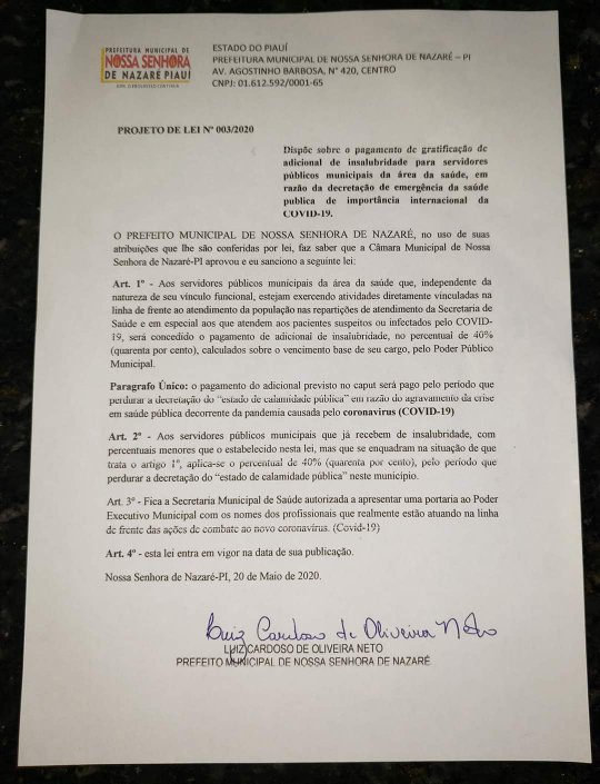 O prefeito Luizinho Cardoso informou por meio de suas redes sociais nesta terça-feira (02) que enviou ao Poder Legislativo Municipal, o Projeto de Lei N° 03/2020, que dispõe sobre o pagamento de gratificação de adicional de insalubridade aos servidores municipais da saúde, que estão atuando na linhade frente das ações de combate ao novo coronavirus (COVID-19).