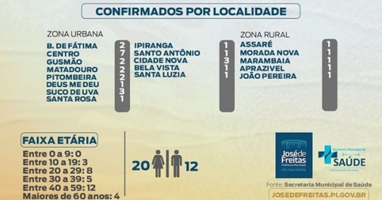 Confira abaixo a faixa etária de idade, bairros e localidades da zona rural de José de Freitas, que confirmaram casos da Covid-19.