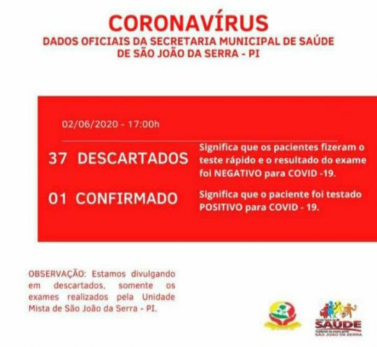 A Secretaria de Saúde do município de São João da Serra registra o primeiro caso positivo de COVID-19. A informação foi divulgada na noite desta terça-feira (02).