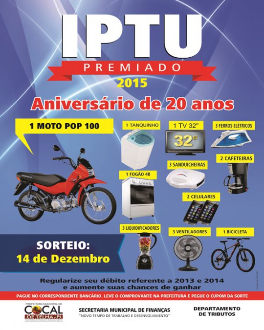 Com o objetivo de incentivar e aumentar a arrecadação do tributo, a Prefeitura de Cocal de Telha através da secretaria Municipal de Finanças e do Departamento Municipal de Arrecadação e Tributos lança a 3ª edição do IPTU PREMIADO. Nesta edição participam do sorteio de 20 (vinte) prêmios todos os contribuintes que pagam o imposto em cota única e ou quitarem débitos referentes aos anos de 2013 e 2014 até dia 14 de Dezembro.