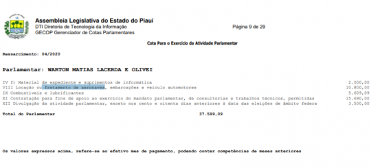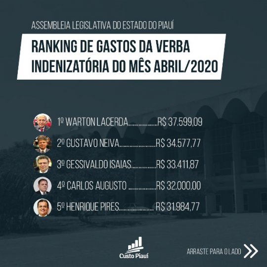 Um levantamento feito pela página Custo Piauí, plataforma que fiscaliza gastos públicos no Estado, apurou que somente no mês de abril de 2020 a Assembleia Legislativa gastou R$ 818.768,00 com verba indenizatória.