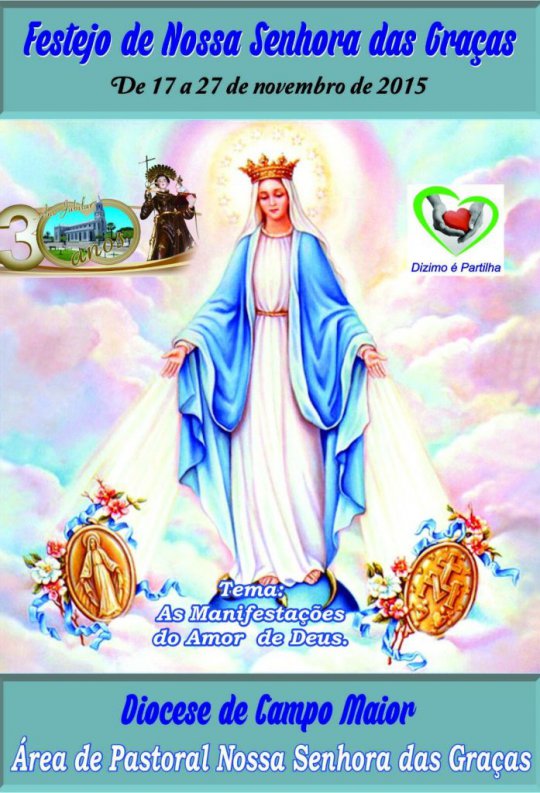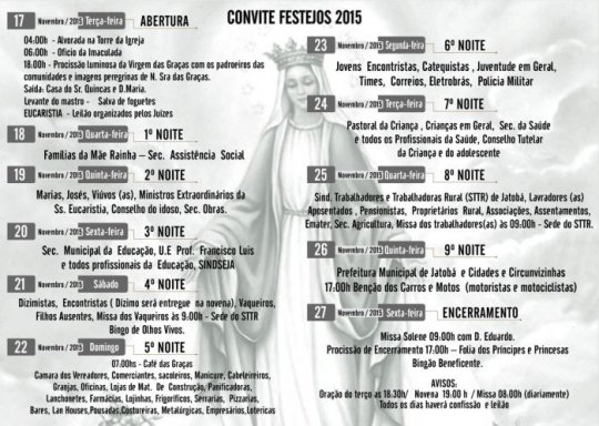 Com o tema: “As manifestações do amor de Deus” começam nesta terça-feira, as festividades a Nossa Senhora das Graças, padroeira de Jatobá do Piauí. O evento vai de 17 a 27 de novembro. Às 18:00hs acontece a Procissão luminosa da Virgem das Graças, com a participação dos padroeiros e padroeiras de todas as comunidades da zona rural.