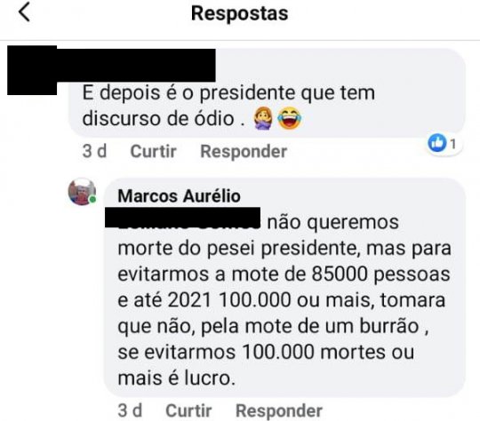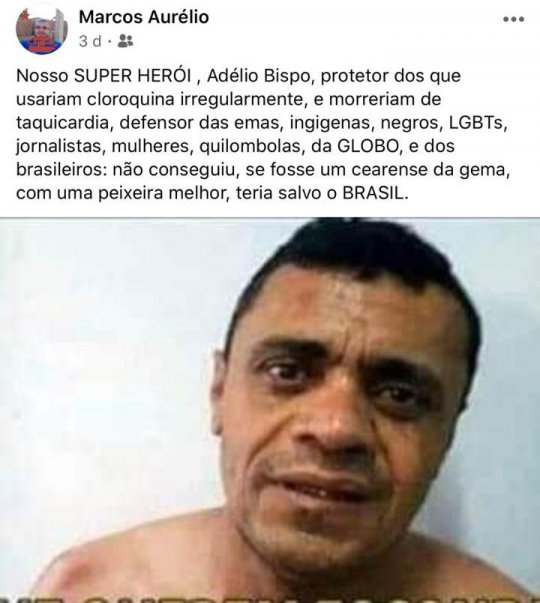 “Nosso super heroi Adélio Bispo. Protetor dos que usariam cloroquina irregularmente e morreria de taquicardia [...] defensor dos brasileiros. Não conseguiu. Se fosse um cearense da gema, com uma peixeira melhor, teria salvo o Brasil” escreveu o secretario. “E depois é o presidente que tem discurso de ódio” respondeu uma internauta na postagem.