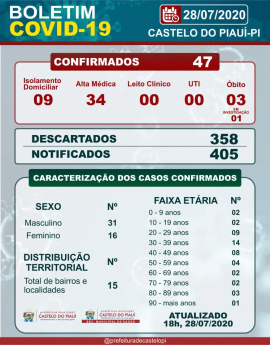 A Secretaria de Saúde do municipio de Castelo do Piauí, atualizou o boletim epidemiólogico da cidade na noite desta terça-feira (28), como vem fazendo diariamente desde os primeiros casos da doença na cidade.