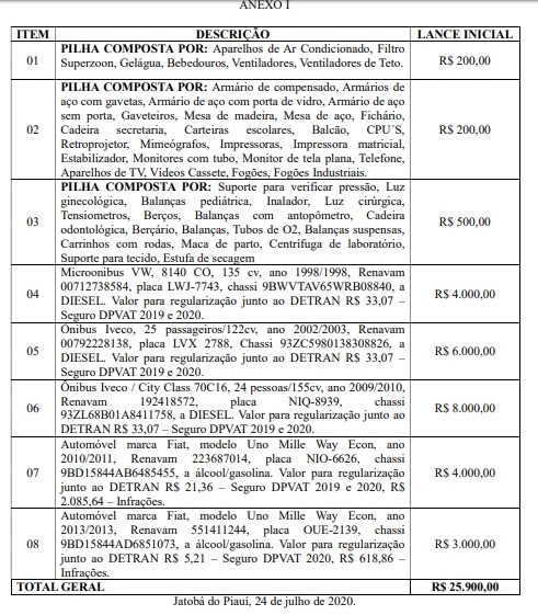 O município de Jatobá do Piauí, através da comissão de licitação, baixou Edital de leilão público Nº 001/2020 para a realização de uma licitação do tipo leilão público na modalidade On-Line, no dia 12/08/2020 às 10 horas, para a alienação dos bens inservíveis.