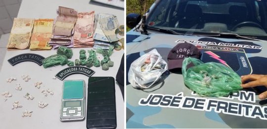 Policiais militares do 16° BPM prenderam dois suspeitos identificados por Francisco Barbosa de Araújo Júnior, vulgo “Bebezão”, Franciel da Silva, vulgo “Ciel ou Cheiroso”, além da apreensão de um menor de iniciais G. O. S, vulgo “Gavião” (17 anos). Com eles, a polícia encontrou várias pedras de crack, maconha e dinheiro trocado.