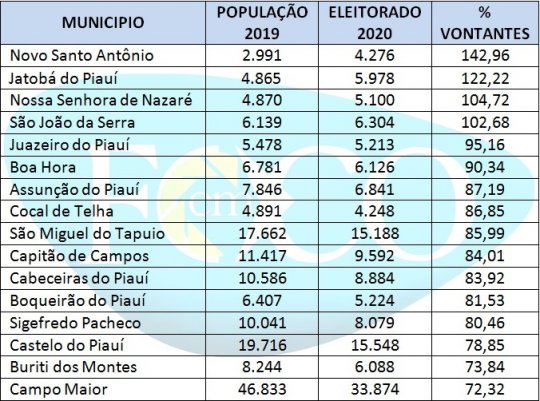 Novo Santo Antonio, Jatobás do Piauí, Nossa Senhora de Nazaré e São João da Serra têm mais eleitores que habitantes. Os dados foram levantados pelo Em Foco com base em números divulgados pelo Tribunal Superior Eleitoral (TSE) e a população dos municípios divulgada pelo Instituto Brasileiro de Geografia e Estatística (IBGE).