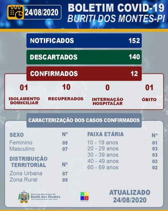 Buriti dos Montes volta a registrar caso após 19 dias sem divulgar novos contaminados. A cidade conta agora com 140 pessoas negativadas para o vírus, 12 confirmadas, sendo 01 em isolamento domiciliar e 10 recuperados, tendo ainda um óbito em decorrência da doença.
