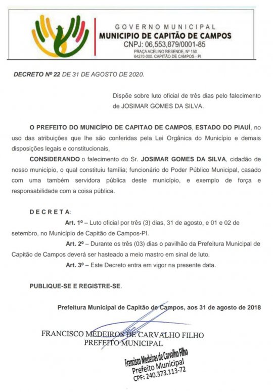 Com a notícia da fatalidade o prefeito do município decretou luto de 03 dias: