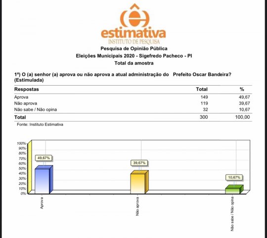 Os dados da pesquisa estimulada apontam que 49,67% dos entrevistados aprovam a administração do prefeito Oscar Bandeira; 39,67 não aprovam e 10,67 não sabe/não opina. Oscar Bandeira está em seu segundo mandato e os números mostram que sua gestão é bem avaliada com quase 50% de aprovação.