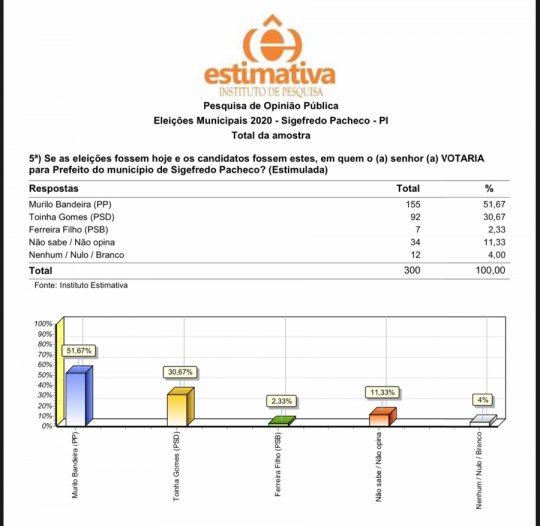 Questionados se as eleições fossem hoje, em quem votariam, 51,67% dos entrevistados afirmou que votaria em Murilo Bandeira; 30,67% em Toinha Gomes; 2,33% em Ferreira Filho; 11,33% não sabe/não opina; 4% nenhum/branco/nulo.