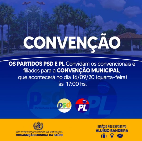 O Pré-candidato do (PSD)-(PL) realizará a homologação de sua candidatura dia 16 de setembro ás 17 horas no ginásio poliesportivo Aluísio Bandeira.