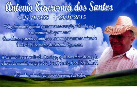 Os familiares do eterno Vereador Quaresma do PT estão convidando parentes e amigos para participarem da missa de 1 (um) de seu falecimento no próximo domingo, dia 29 as 9 horas na Igreja de São José Operário.