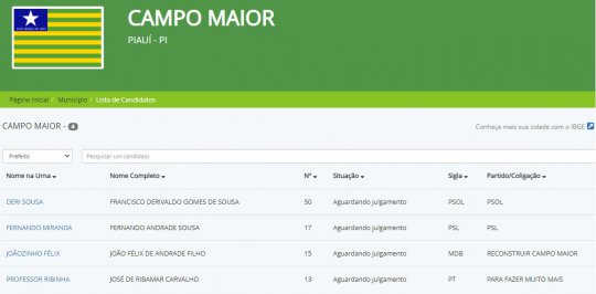 Quatro candidatos a prefeitos de Campo Maior já lançaram seus registros no site do Tribunal Regional Eleitoral (TRE-PI) para disputar a eleição deste ano de 2020, são eles: Deri Sousa (PSOL), Professor Ribinha (PT), Fernando Miranda e João Félix (MDB).