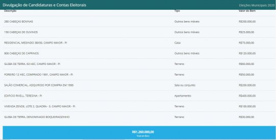 Todos os candidatos são obrigados a declararem seus bens à justiça eleitoral. Dentre os três que já aparecem no site do TRE, o ex-prefeito João Félix é o mais rico. Ele declarou que possui um total de R$1.260.000,00 (Um milhão e duzentos e sessenta mil reais). Os bens pertencentes ao ex-prefeito inclui casas, terrenos, animais, prédios comerciais e apartamentos. Não foi informado se ele possui carro.