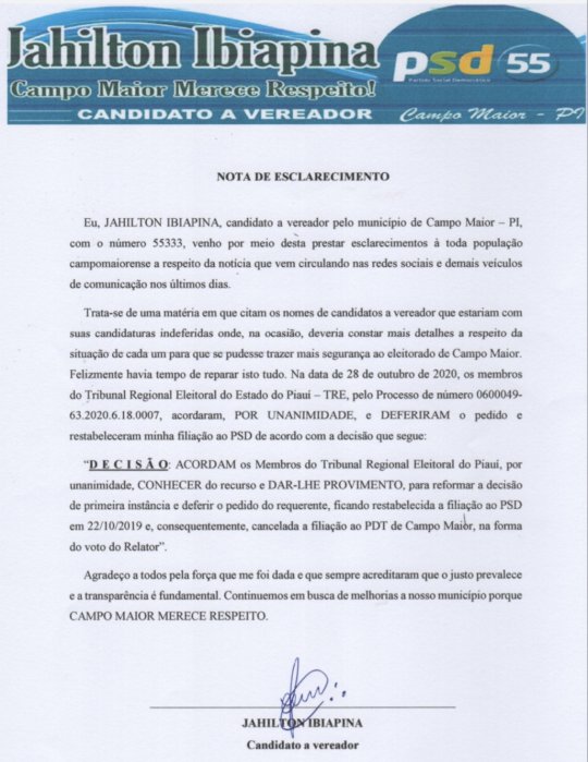 Na nota, o candidato diz que por unanimidade, deferiu sua candidatura através da reforma da decisão de primeira instância e poderá concorrer às eleições 2020, segundo o processo Nª 0600049-63.2020.6.18.0007 do TRE.