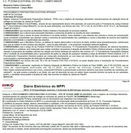 O Promotor de Justiça Eleitoral da 7ª zona eleitoral de Campo Maior, Marcondes Pereira de Oliveira, abriu Procedimento Preparatório Eleitoral Nº03/2020 (SIMP Nº 85-222/2020 – Portaria Nº10/2020) com o objetivo de investigar elementos caracterizadores de captação ilícita de sufrágio no município de Jatobá do Piauí-PI.