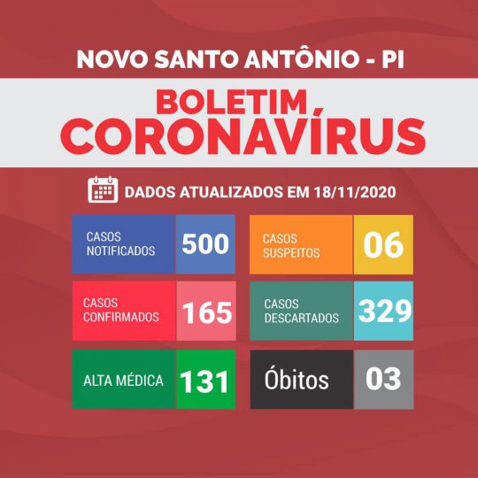 Dia 30 de outubro foi o ultimo Boletim epidemiológico divulgado pela prefeitura municipal de Novo Santo Antonio-PI sobre os casos de contaminação pelo novo coronavírus. Naquele momento o Boletim apontava 123 casos confirmados e um óbito.