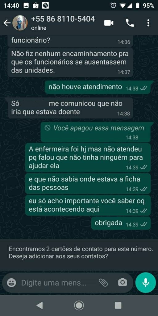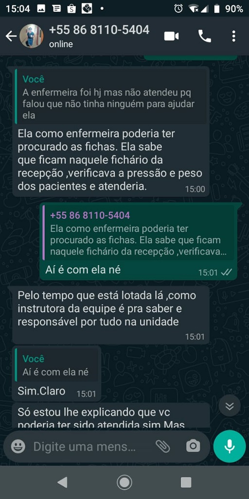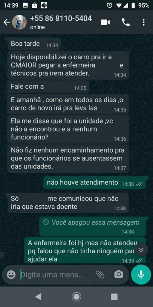 A secretaria de Saúde Noêmia Oliveira foi avisada do problema por uma paciente e disse que disponibilizou carro para levar funcionários, e que não fez nenhum encaminhamento para funcionários se ausentarem da Unidade. Disse ainda que uma Técnica de Enfermagem lhe comunicou que estava doente e faltaria ao trabalho e sugeriu, nas mensagens (abaixo), que e Enfermeira poderia ter feito todo o serviço de atendimento, como procurar ficha, aferir pressão e peso do paciente. A falta dos demais funcionários foi o motivo pelo qual o posto não funcionou.