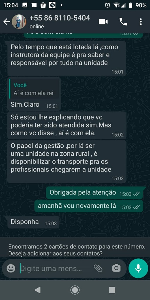 Por último, a secretária disse que o papel da gestão, pelo fato da Unidade de Saúde ser na zona rural, é disponibilizar o transporte para os profissionais chegarem à Unidade.