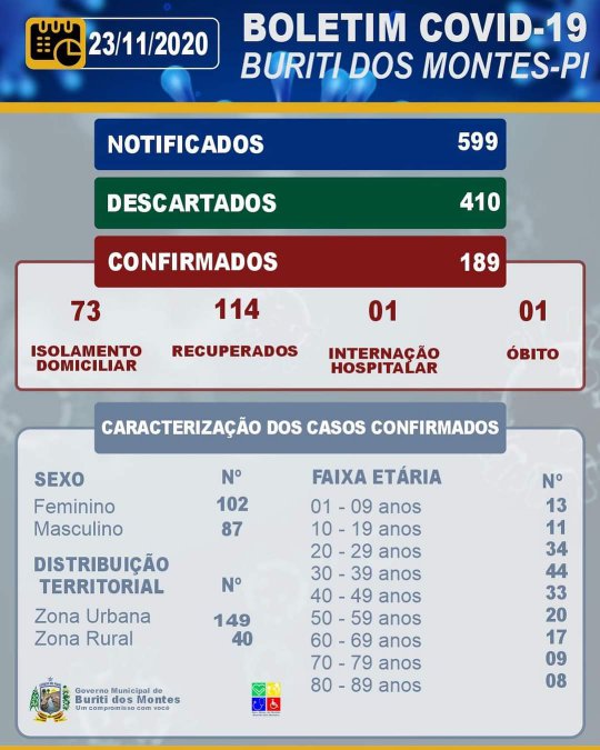 Com 599 casos notificados, Buriti dos Montes já confirmou 189 e descartou outros 410. O município conta 73 pessoas em isolamento domiciliar, 114 já recuperados, 01 em internação hospitalar e 01 óbito.