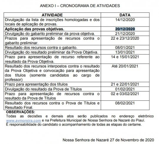 A Comissão Organizadora do Concurso Público Edital nº 001/2020, do Município de Nossa Senhora de Nazaré, divulgou novo cronograma do concurso público para preenchimento de vagas no serviço municipal.