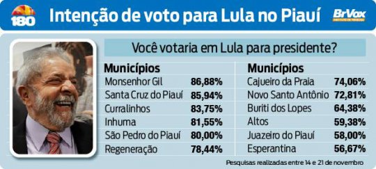 Uma pesquisa divulgada na última segunda-feira (30/11) pelo instituto BrVox mostrou que 58% dos eleitores de Juazeiro do Piauí votariam no ex-presidente Lula caso o petista voltasse a se candidatar ao planalto.