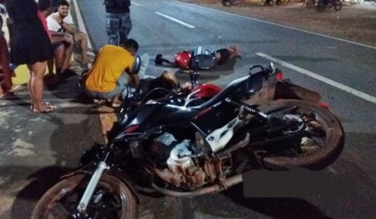 O rapaz que aparece de blusa branca, pilotando a moto de cor vermelha, entrou na via, ocorrendo o choque, a colisão. Um dos ocupantes da moto de cor preta teve um corte no joelho e suspeita de fratura no pé. Os outros dois envolvidos tiveram fermentos mais leves.