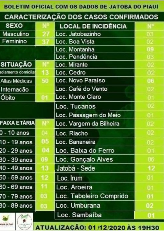 NOTÍCIAS RELACIONADAS - Prefeitura de Jatobá/PI não divulga boletim Covid-19 há 11 dias e município tem 7 novos casos, segundo SESAPI