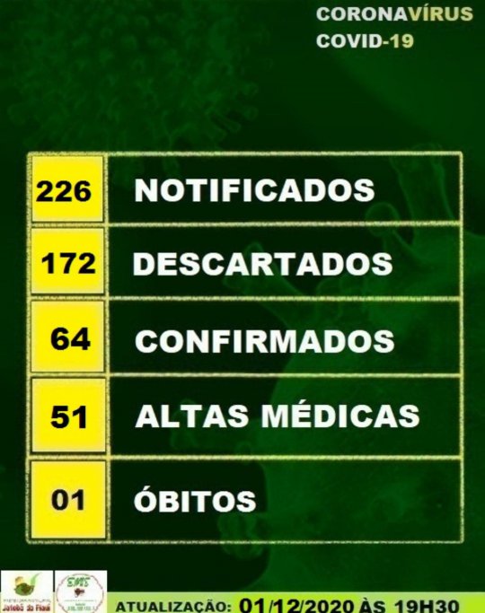 Já são 64 pessoas infectadas,172 descartados, 226 notificados, 51 altas médicas e 01 óbito de acordo com o boletim epidemiológico. A população deve continuar com as medidas de prevenção. Dos bairros com maior número de casos estão: Jatobá-Sede com 12 casos, e Loc. Montanha com 09 casos, Loc.Novo Paraíso com 06 casos.