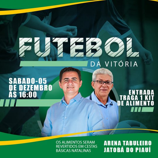 Em comemoração a vitória nas eleições municipais 2020, o prefeito eleito, Hilton Gomes, realizará o futebol beneficente neste sábado (05) a partir das 16:00 hrs na arena tabuleiro em Jatobá do Piauí. Para participar deste evento, basta levar 01 kit de alimento não perecível que será revestido em cestas básicas natalinas para as famílias carentes do muncípio.