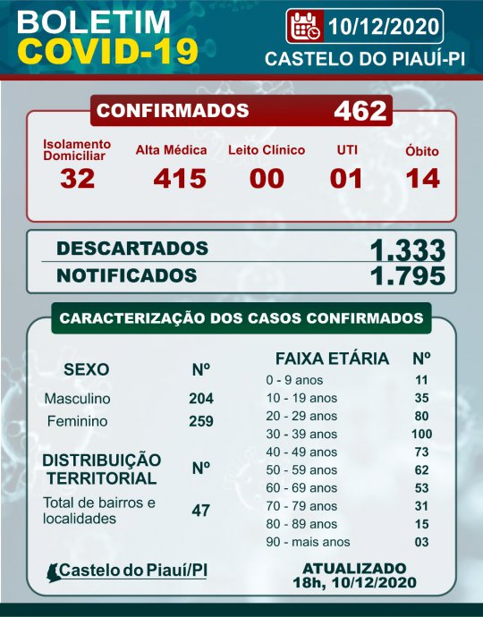 Ainda d acordo com o boletim, de um total de 1.795 pessoas testadas, 1.333 casos foram descartados, 462 confirmados, sendo destes 415 já recuperados, 32 ainda em isolamento domiciliar, 01 em UTI e 14 óbitos já registrados no municipio.
