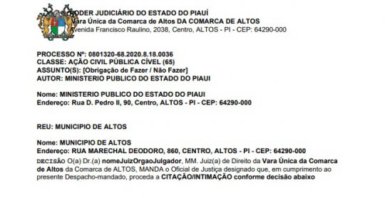A Juíza da Comarca de Altos, Andrea Parente Lobão Veras determinou o bloqueio das contas da Prefeitura Municipal de Altos a pedido do Ministério Público com o objetivo de garantir o pagamento dos servidores municipais.