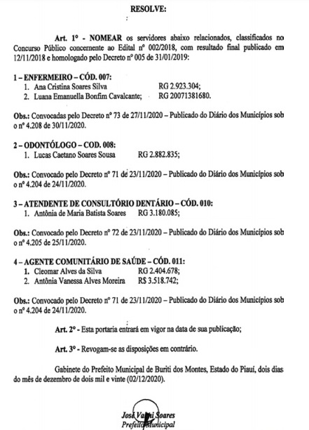 A denúncia com Pedido de Medida Cautelar foi feita por José Juliardo Soares Monte – Coordenador da Equipe de Transição do prefeito eleito Olavo Junior e foi aceita pelo TCE. Ficou determinado que o prefeito Valmi Soares suspenda os efeitos dos Decretos nº 71, 72 e 73/2020, a Portaria Nº 36, bem como, que se abstenha de convocar novos candidatos aprovados do certame nº 02/2018, até que haja comprovação de que tais admissões visam a reposição de vacância de pessoal efetivo, e de que há vaga disponível, criada por lei, para novos provimentos.