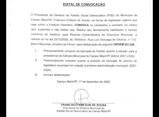O presidente do diretório municipal do PSD de Campo Maior, Edilson Sousa, em forma da legislação vigente divulgou um edital convocando os candidatos a vereador (a) eleitos (as), suplentes e não eleitos (as), filiados (as) devidamente habilitados e demais membros do diretório para uma reunião extraordinária da executiva municipal que será realizada na próxima terça-feira (22/12), às 19h, na Rua Luís Gonzaga de Oliveira, nº 172, Bairro Mucuripe, próximo ao Fórum, para deliberação da ordem do dia.