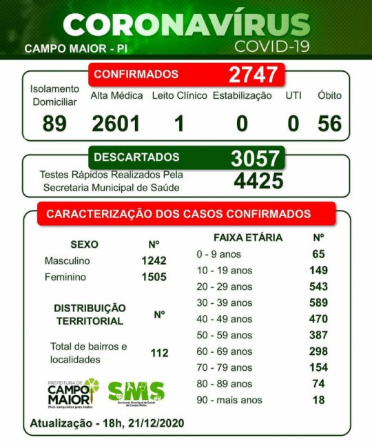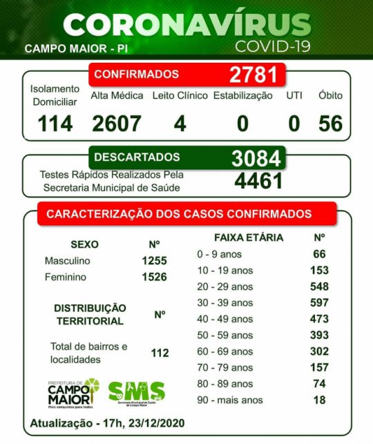 No boletim epidemiológico divulgado nesta quarta-feira (23), o número de pessoas em isolamento domiciliar está em 114. Pessoas internadas em leitos clínicos são 04. Na última segunda-feira (21/12), 89 pessoas estavam isoladas em casa, e 01 estava em leito de infermaria. No total, 56 campomaioreses já prederam a vida por causa da Covid.