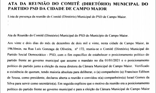 No último dia 22 de dezembro de 2020 o diretório municipal do PSD em Campo Maior se reuniu para definir o posicionamento da sigla diante da eleição da mesa diretora da Câmara e como a bancada vai se comportar diante da nova gestão municipal.
