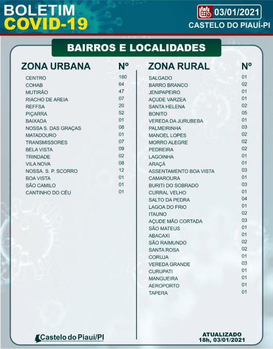 Castelo do Piauí, durante a Pandemia já registrou 475 casos confirmados, sendo 05 ainda em isolamento domiciliar, 456 já em alta médica e 14 óbitos registrados.