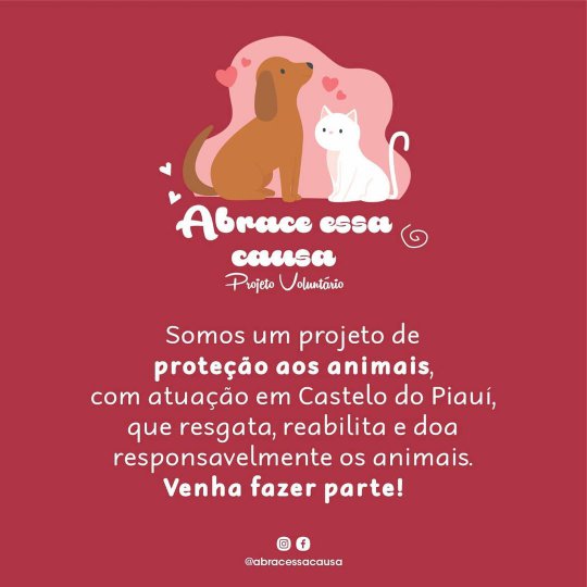 Para tanto, as criadoras do projeto precisam de apoio financeiro para continuarem o serviço voluntário, e expandirem com a construção de um canil/gatil. Caso tenha interesse em adotar um dos animais ou realizar uma doação, entrar em contato pelo perfil no instagram "Abrace essa causa" e saiba todas as formas de contribuir.